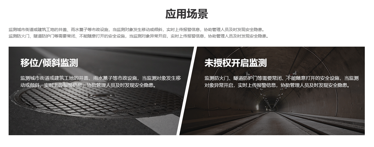 監(jiān)測城市街道或建筑工地的井蓋、雨水篦子等市政設(shè)施,當(dāng)監(jiān)測對(duì)象發(fā)生移動(dòng)或傾斜,實(shí)時(shí)上傳報(bào)警信息,協(xié)助管理人員及時(shí)發(fā)現(xiàn)安全隱患。