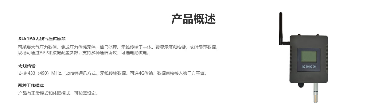 XL51PA無線氣壓傳感器,采集大氣壓力數值,集成壓力傳感元件、信號處理、無線傳輸于一體。帶顯示屏和按鍵,實時顯示數據,現場可通過APP和按鍵配置參數,支持多種通信協議。