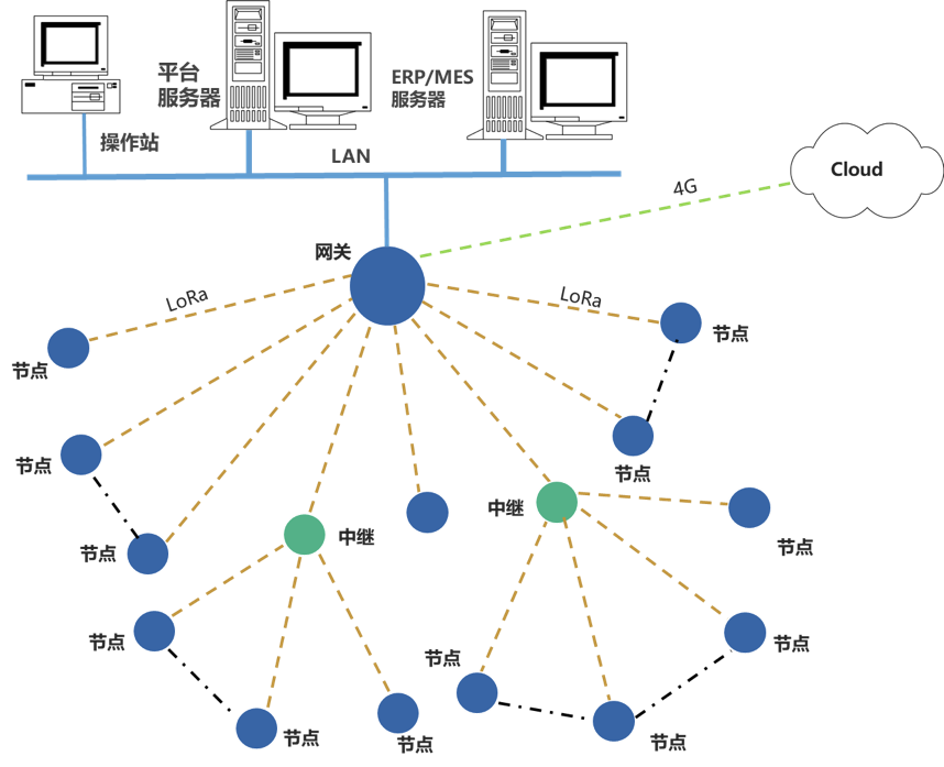 LoRa網(wǎng)絡(luò)是自定義通訊參數(shù)的LoRa通信網(wǎng)絡(luò);設(shè)計(jì)有中繼可延長無線傳輸距離。物聯(lián)網(wǎng)關(guān)對節(jié)點(diǎn)的數(shù)據(jù)進(jìn)行通信協(xié)議轉(zhuǎn)換,可選多種通信接口、不同的通信協(xié)議,同時(shí)上傳數(shù)據(jù)至多個(gè)平臺(tái)服務(wù)器。
