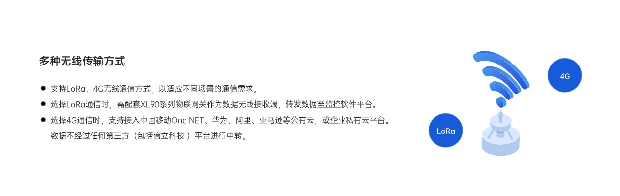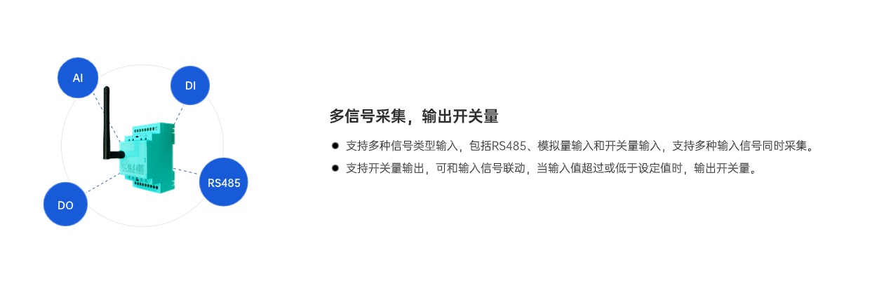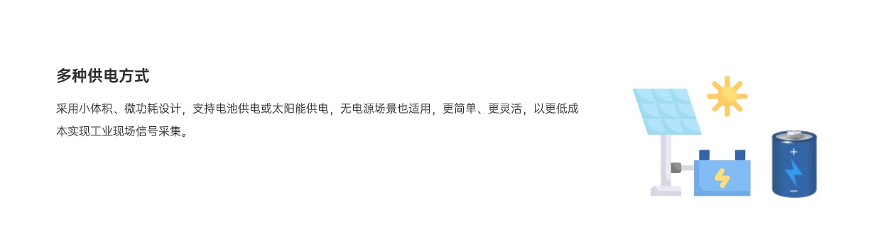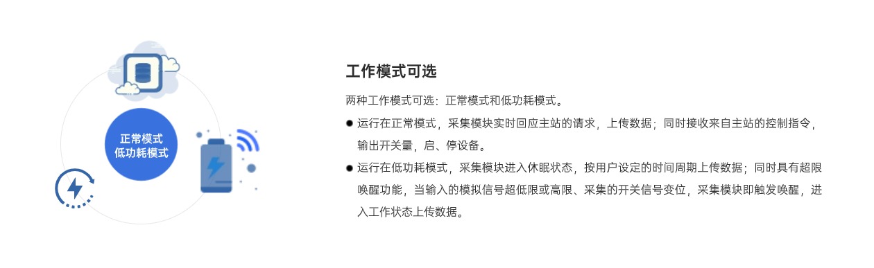 用于監(jiān)測點分散、數(shù)量少、供電不方便的場景。電池供電,變位、超限觸發(fā)功能,更適用于變送儀表信號、開關(guān)接點信號采集。