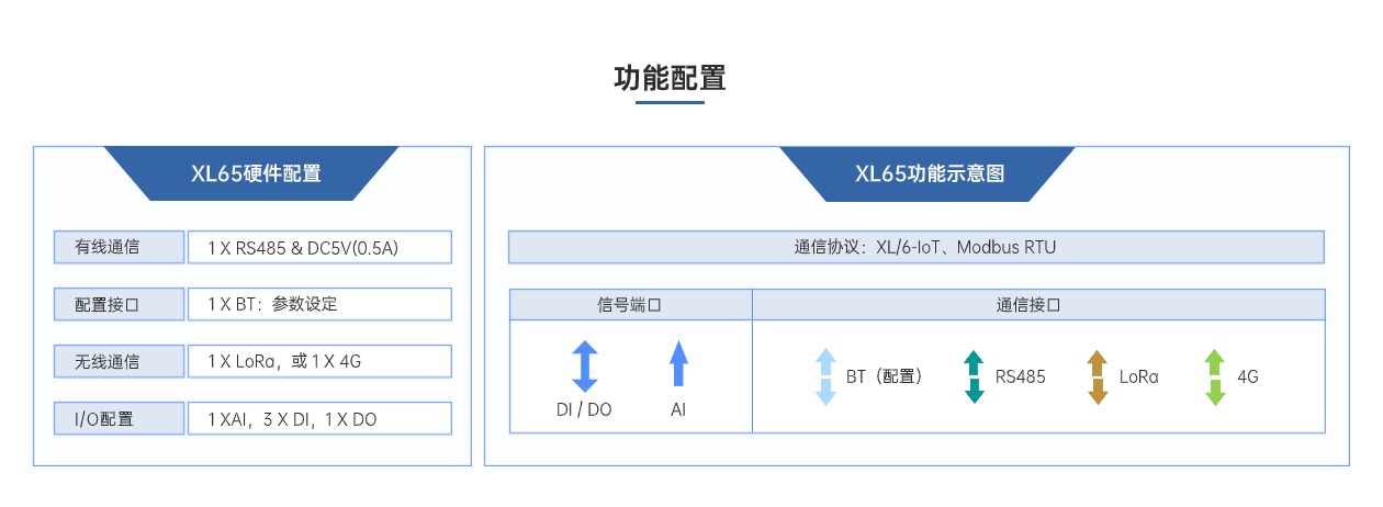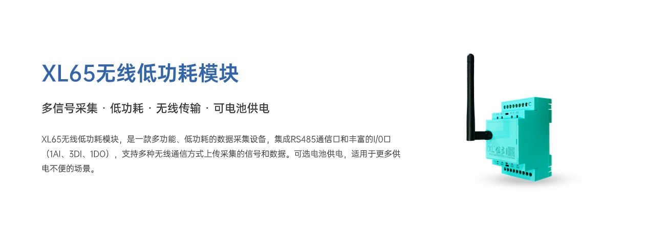 XL65無線低功耗模塊,是一款多功能、低功耗的數(shù)據(jù)采集設(shè)備,集成RS485通信口和豐富的I/0口(1AI、3DI、1DO),支持多種無線通信方式上傳采集的信號和數(shù)據(jù)。可選電池供電,適用于更多供電不便的場景。