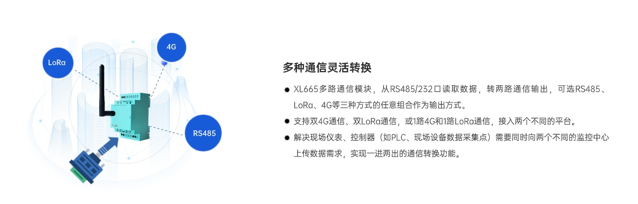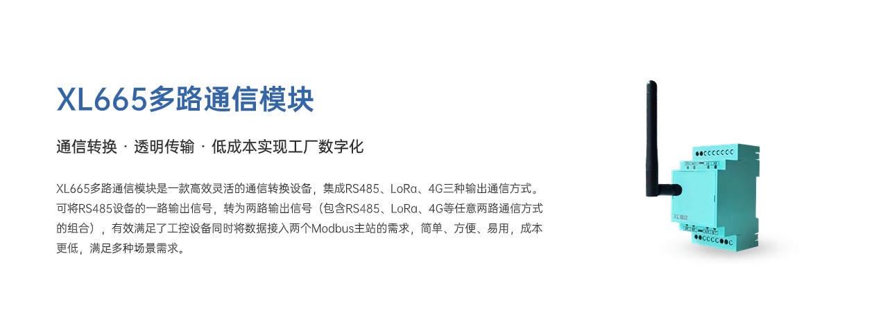 XL665多路通信模塊是一款高效靈活的通信轉(zhuǎn)換設(shè)備,集成RS4852、LoRa、4G三種輸出通信方式。可將RS485設(shè)備的一路輸出信號,轉(zhuǎn)為兩路輸出信號,(包含RS485、LoRa、4G等任意兩路通信方式的組合),有效滿足了工控設(shè)備同時將數(shù)據(jù)接入兩個Modbus主站的需求,簡單、方便、易用,成本更低,滿足多種場景需求。