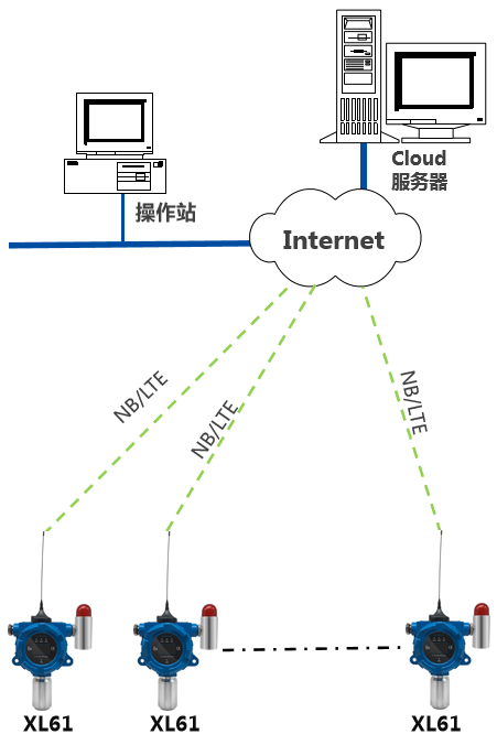 4、如增加現(xiàn)場(chǎng)集中監(jiān)控點(diǎn),可配置XL97網(wǎng)關(guān)終端,讀取區(qū)域內(nèi)XL61上傳的數(shù)據(jù),分析處理、顯示、報(bào)警,并轉(zhuǎn)發(fā)至監(jiān)控中心服務(wù)器。