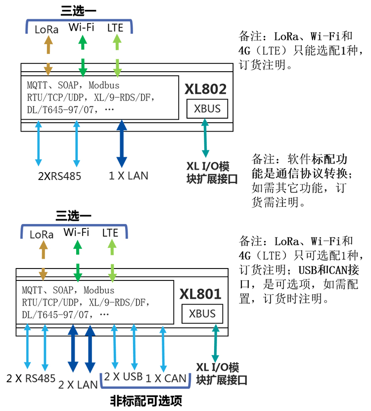 對采集點數據量小,需要Ethernet、RS485、CAN、USB 等通信接口讀取數據,要聯接多臺設備,選擇XL80智能主機,配置LoRa通信。