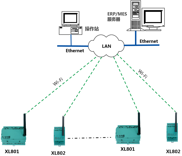 XL80X選擇Wi-Fi通信方式,適用于工廠車間內的數據采集和無線傳輸,且有局域網Wi-Fi覆蓋的區(qū)域。