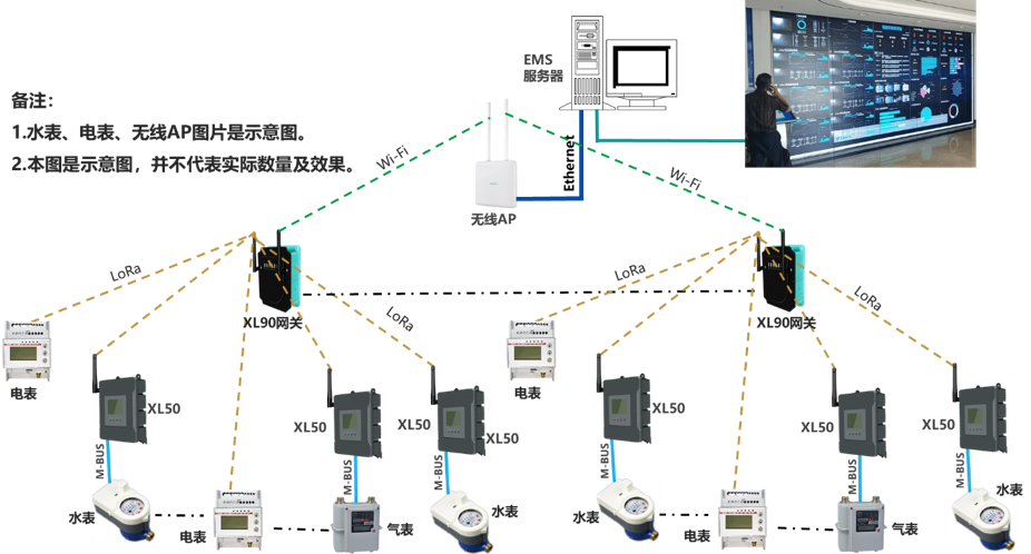 物聯(lián)網關通過LoRa無線讀取水、電、氣等表計的數(shù)據,通過Wi-Fi推送數(shù)據至EMS(能源管理)服務器,無線AP起到橋梁作用。無線AP通過以太網接口,直接聯(lián)接EMS服務器。