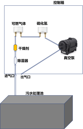 l 過程:用聚四氟乙烯管,聯(lián)接整個氣體通路。管直接伸入污水池,聯(lián)接控制箱進(jìn)氣口,氣體從進(jìn)氣口,至過濾器、除濕器,至傳感器探頭進(jìn)、出氣口(兩臺傳感器的進(jìn)、出氣口串聯(lián)),至真空泵抽氣口,從真空泵排氣口聯(lián)接控制箱出氣口;