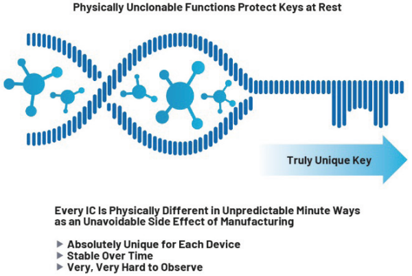 不幸的是,由于直接探測會試圖監(jiān)視微電路的內(nèi)部結(jié)構(gòu),因此通用微控制器中常用的存儲器技術(shù)(即 EEPROM或閃存)并不安全。利用掃描電子顯微鏡(SEM),攻擊者無需很高成本,即可直接監(jiān)視存儲器的內(nèi)容。為了降低此風(fēng)險,半導(dǎo)體行業(yè)開發(fā)了“物理不可克隆功能”(PUF) 技術(shù)。PUF 用來從微電路的固有物理屬性中導(dǎo)出唯一密鑰。這些因芯片而異的屬性很難直接探測,因此難以通過直接探測提取生成的密鑰。在一些情況下,PUF派生密鑰會對信任根內(nèi)部存儲器的其余部分進(jìn)行加密,從而保護(hù)設(shè)備上存儲的所有其他密鑰和憑據(jù)。
