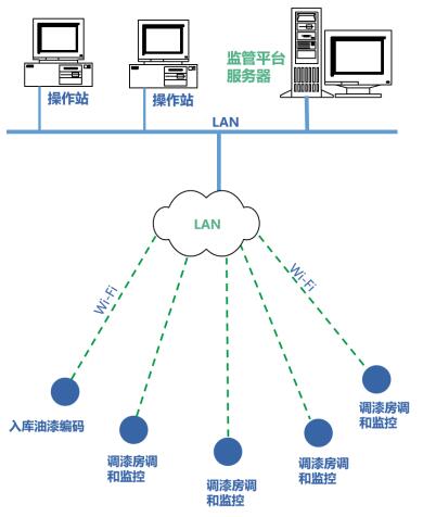 設(shè)計油漆調(diào)和監(jiān)管系統(tǒng),由監(jiān)管平臺服務器、油漆調(diào)和操作監(jiān)控終端、電子枰、油漆編碼終端、操作站等構(gòu)成,通過工廠內(nèi)的局域網(wǎng)(WI-FI)進行通信連接。