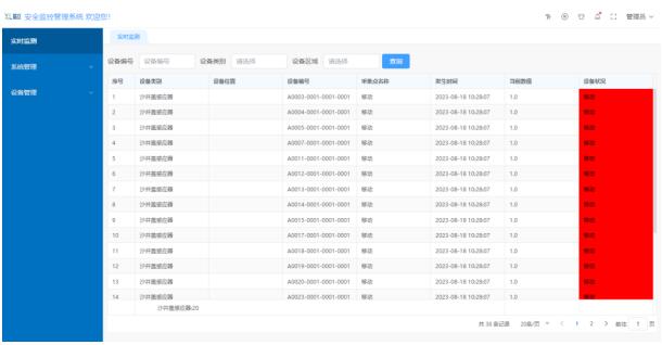 首頁(yè)實(shí)時(shí)顯示處于報(bào)警狀態(tài)的設(shè)備,設(shè)備當(dāng)前狀態(tài)、位置一目了然,管理人員根據(jù)監(jiān)測(cè)數(shù)據(jù)及時(shí)作出應(yīng)對(duì)處理,避免安全事故的發(fā)生。