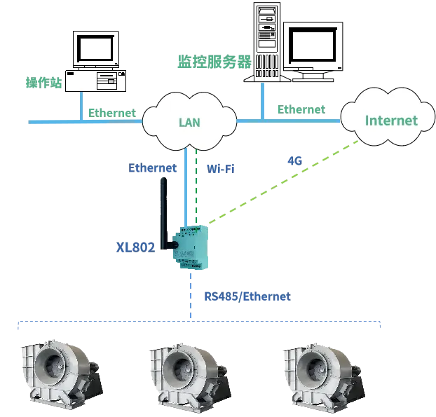 選擇XL802通信主機(jī),接入離心風(fēng)機(jī)的PLC,實(shí)時采集設(shè)備風(fēng)量、風(fēng)壓、轉(zhuǎn)速、功率等運(yùn)行參數(shù)。