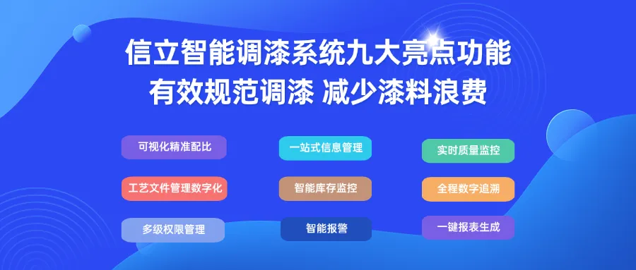 信立智能調(diào)漆系統(tǒng)XPMS,九大亮點功能設(shè)計,逐一解決調(diào)漆過程固有問題,降低對人的依賴,減少漆料浪費,更準(zhǔn)確完整地計算統(tǒng)計漆料的使用及產(chǎn)出。