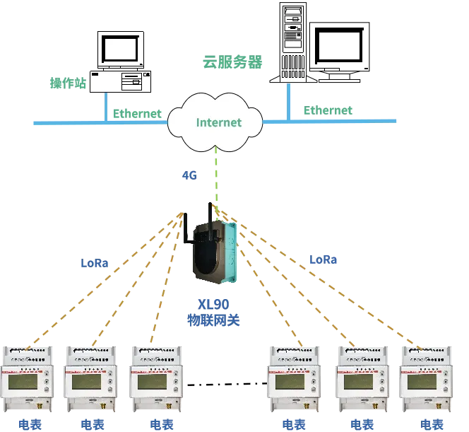 DTSD3366XL無線多功能電表獲取數(shù)據(jù),通過LoRa無線傳輸方式上傳至XL90網(wǎng)關(guān);XL90網(wǎng)關(guān)計(jì)算分析讀取的能耗數(shù)據(jù),并通過4G無線通信方式,將數(shù)據(jù)上傳至監(jiān)控平臺(tái)。