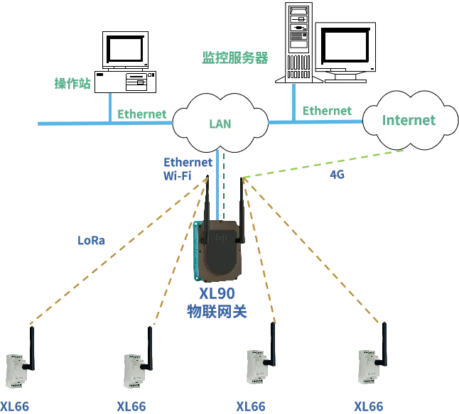 XL66串口無線轉(zhuǎn)換模塊通過LoRa將數(shù)據(jù)無線傳輸至XL90物聯(lián)網(wǎng)關(guān),網(wǎng)關(guān)通過以太網(wǎng)、Wi-Fi上傳數(shù)據(jù)至監(jiān)控平臺、PLC、觸摸屏、控制器等設(shè)備,或通過4G無線上傳數(shù)據(jù)至云平臺。