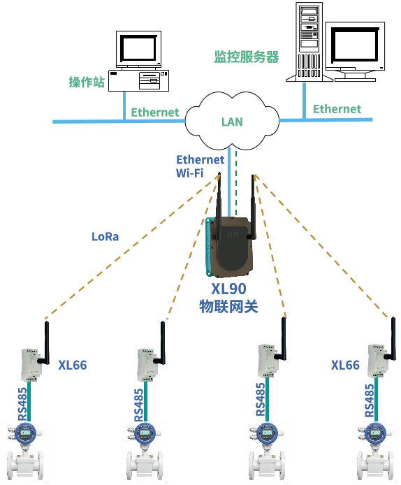 構(gòu)建星型 LoRa 無線傳輸網(wǎng)絡(luò),以XL90物聯(lián)網(wǎng)關(guān)為中心節(jié)點,多個XL6666作為終端節(jié)點分布在各個流量計安裝位置。XL6666 采集流量計數(shù)據(jù)后,通過 LoRa 無線傳輸數(shù)據(jù)給網(wǎng)關(guān),網(wǎng)關(guān)通過Ethernet/WiFi將數(shù)據(jù)傳輸給中控室服務(wù)器。