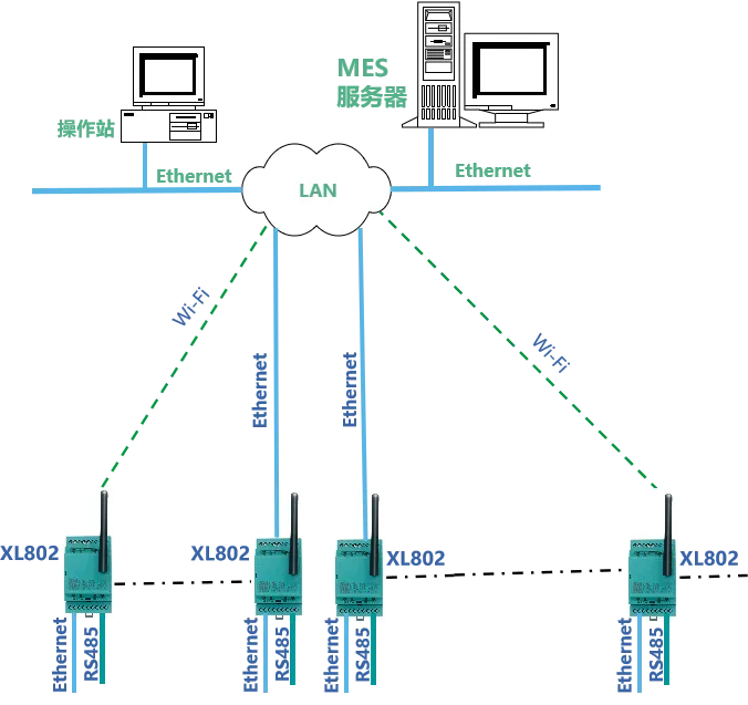 數(shù)據(jù)聯(lián)網(wǎng):XL80通信主機(jī)從設(shè)備通信接口讀取設(shè)備或系統(tǒng)的運(yùn)行數(shù)據(jù),通信協(xié)議轉(zhuǎn)換處理后,再通過(guò)Ethernet或Wi-Fi,接入企業(yè)LAN,轉(zhuǎn)發(fā)數(shù)據(jù)至MES或監(jiān)控平臺(tái)。