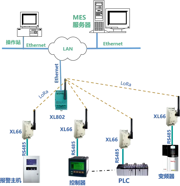 數(shù)據(jù)聯(lián)網(wǎng):XL80主機(jī)通過(guò)LoRa無(wú)線傳輸技術(shù),從XL66無(wú)線讀取設(shè)備的運(yùn)行數(shù)據(jù),通信協(xié)議轉(zhuǎn)換處理后,通過(guò)Ethernet轉(zhuǎn)發(fā)數(shù)據(jù)至MES或監(jiān)控平臺(tái)。
